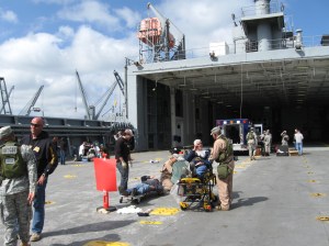 The exercise on the Cape Orlando in Alameda was to test whether a maritime ship could be used as a medical triage center should local hospitals become overwhelmed due to a natural disaster or terrorist attack. Students and reservists alternated playing the roles of victim and medical provider.