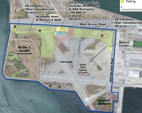 The land for this 110-acre project sits on the former runways and is part of the 549 acres formerly slated to become the “Alameda National Wildlife Refuge.” All 549 acres will be acquired through a no-cost federal-to-federal land transfer from the Department of Defense (the Navy) to the VA. This transfer has been in the works since 2006, when the U.S. Fish & Wildlife Service declined to take the land. Fish & Wildlife did not want to be perpetually responsible for monitoring toxic issues at the old disposal site in the western wetlands area. While the VA needs only 110 acres for its project, the Navy said the VA had to take all the land or none of it.