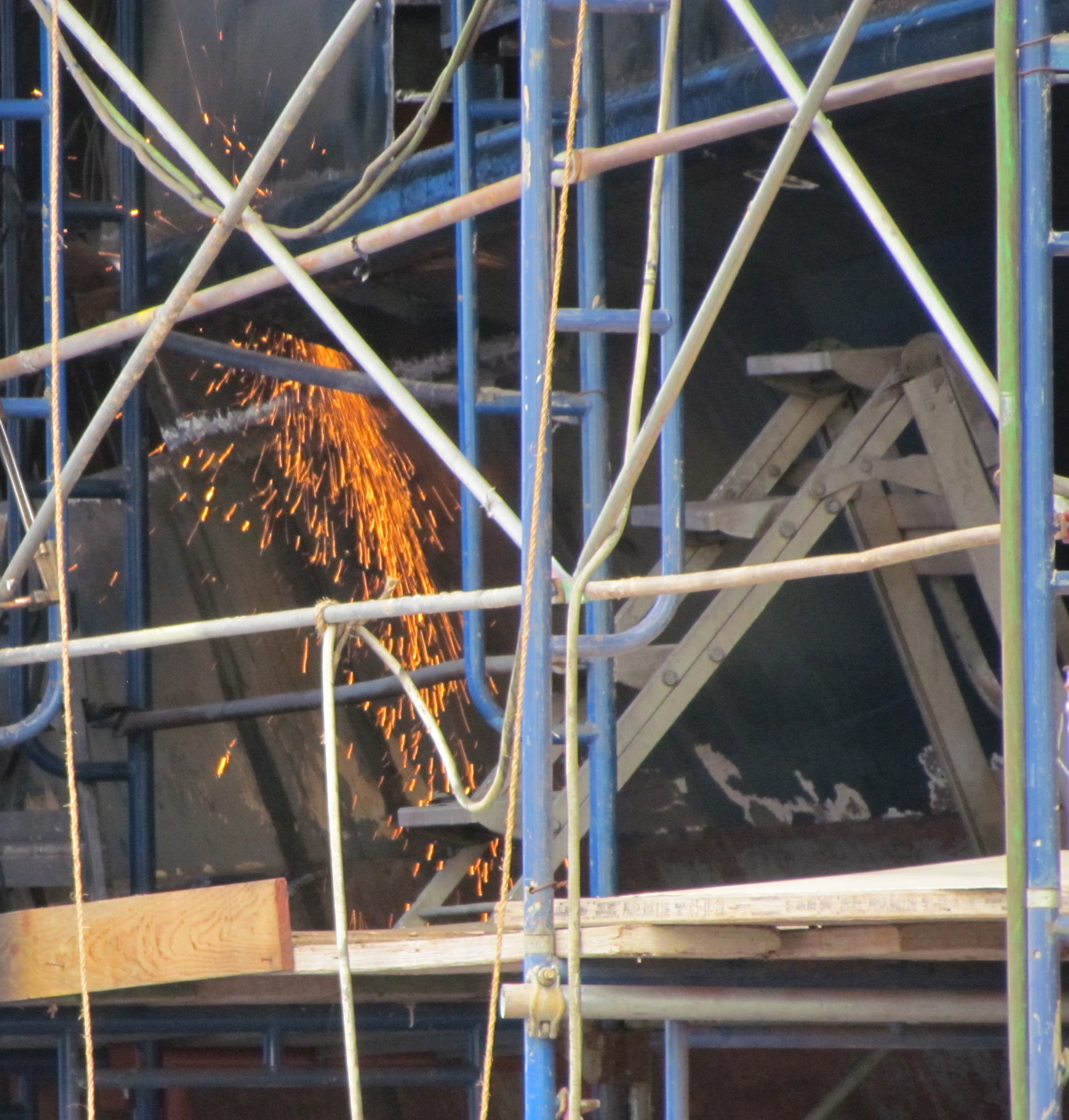 The Bay Ship shipyard allows for work on 12 vessels at once. Becker, who has worked at Bay Ship for 16 years, says “It’s a great place to work.” Besides being outdoors, “it’s the safest place I have ever worked.” Workers at Bay Ship have daily safety meetings and specialized ones once a week. They repair all kinds of vessels and propellers, performing work that entails sandblasting, painting, joinery, and fabrication. Since arriving in Alameda, the Sea Bird alone has had 11,000 pounds of metal cropped out and replaced.