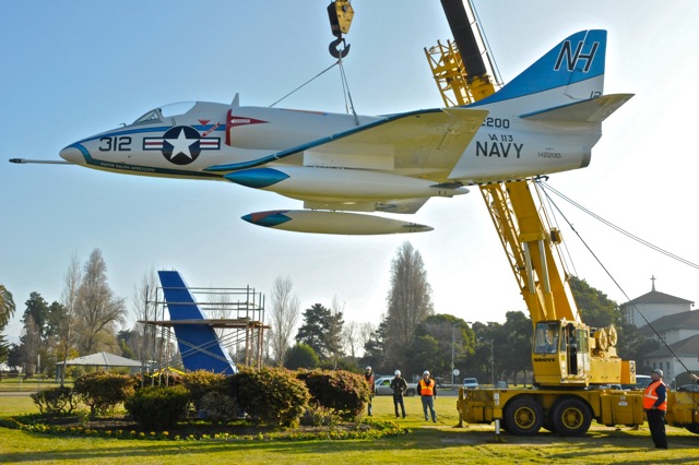 In June 2011, a crane accidentally dropped the Navy’s A-4 Skyhawk while putting it back on its pylon at Alameda Point’s “main gate.” People have various theories about what went wrong, but everyone close to the project would rather focus on the plane’s re-restoration and return.