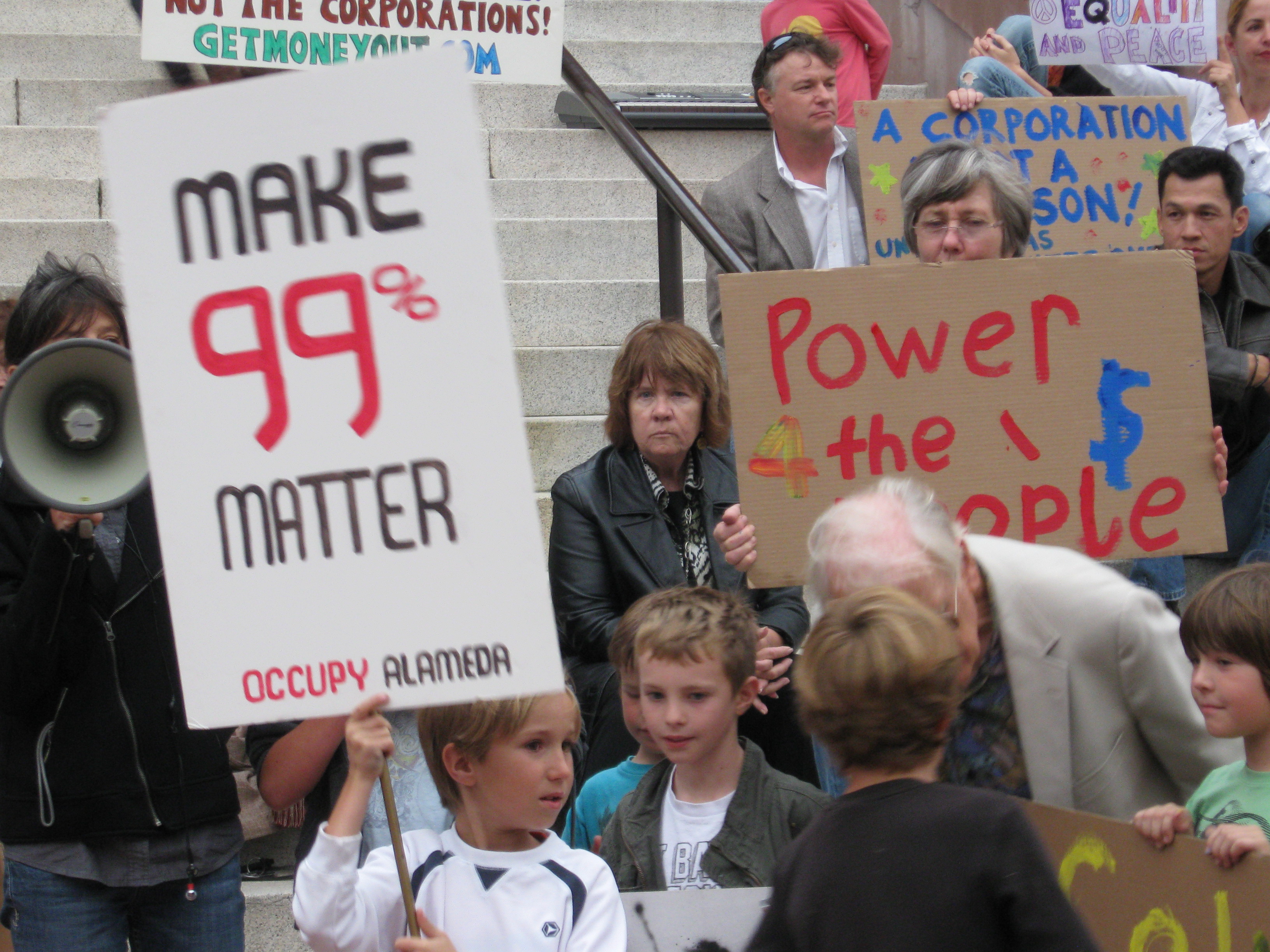 Many Alamedans stood in solidarity with the national movement. We rallied and marched peacefully in October and November, 2011, and encouraged people to move their money to community banks and credit unions. Berkeley just voted to move its money to a community bank. Organized groups around the country are trying to influence lawmakers to make the system fairer, such as declaring that corporations are not people, charging a fee for stock trading, reinstituting better financial regulations, and making the rich pay higher taxes.