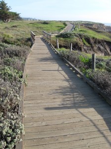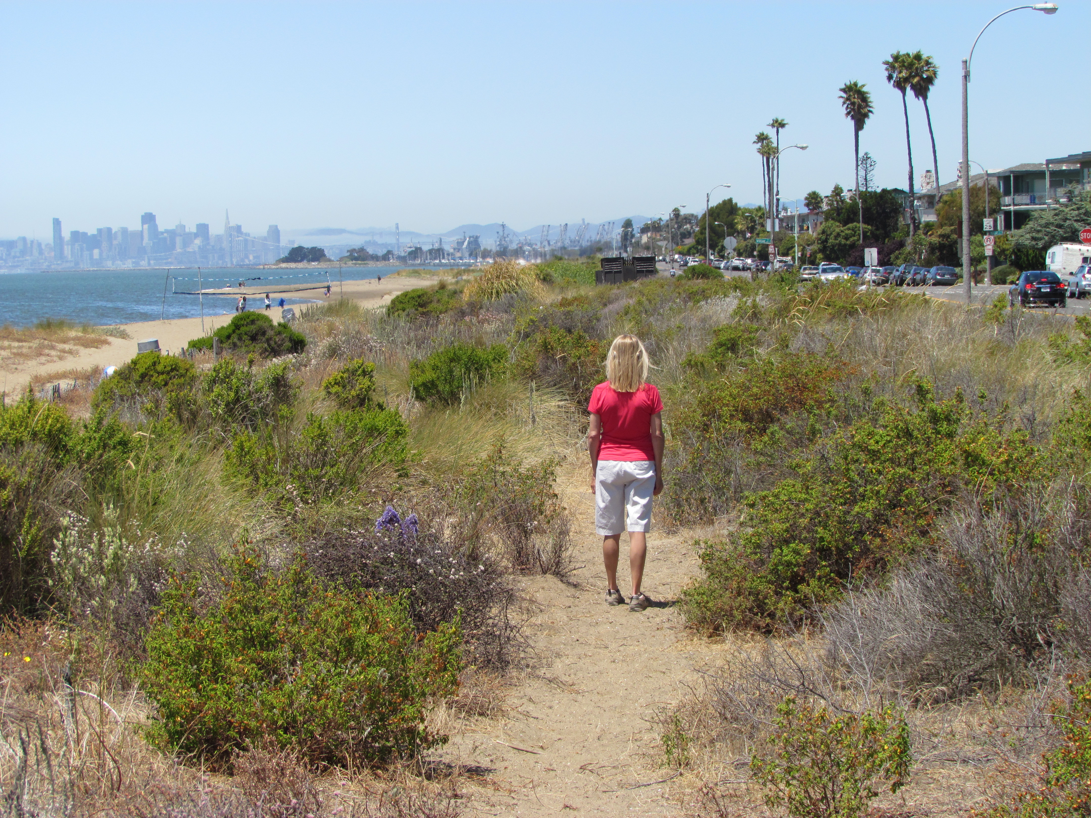 The mounded, landscaped sand dune along the entire beachfront was created in the 1980s to prevent erosion and act as a barrier to keep windblown sand and water off the street. The plants stabilize the dune. Why not construct a walking trail on top of that dune? It would offer pedestrians premier views of the beach. Cyclists could remain on the existing asphalt trail below. And, at the eastern end of Shoreline where the dune ends and the bird sanctuary begins, there is more than adequate right-of-way to continue the walking path.