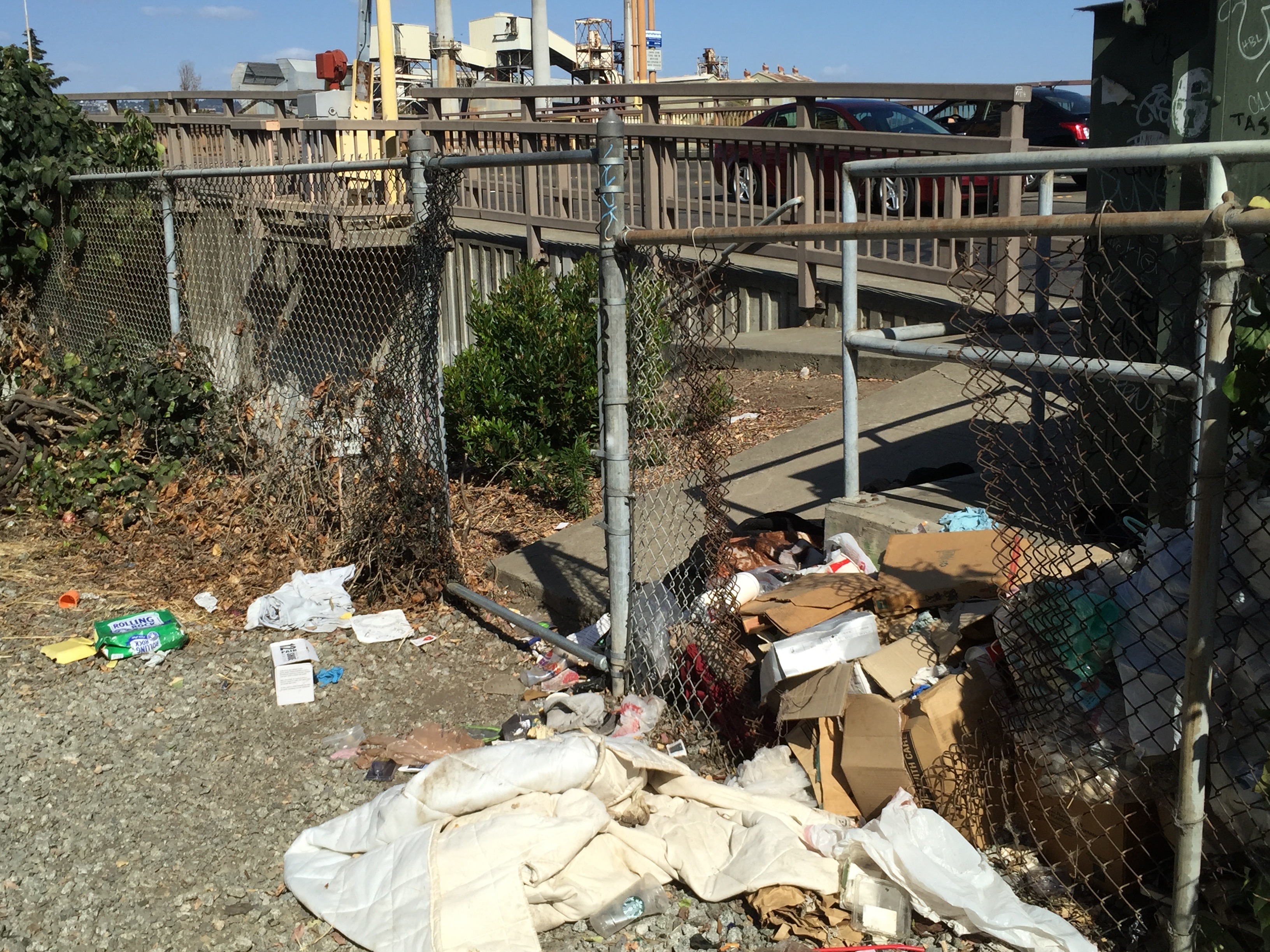 Hidden behind trees near Pet Food Express next to the Fruitvale Bridge is a plot of land where a sprawling pile of trash has been accumulating for about a year. Someone is living there and bringing in the items that lie strewn about the area. A large kiosk-type structure has been built. A barbeque grill is a potential fire hazard, considering all the debris and pine needles on the site. The cyclone fence leading to the bridge has been torn away, allowing easy ingress and egress for the homeless. The area has become a public health issue.