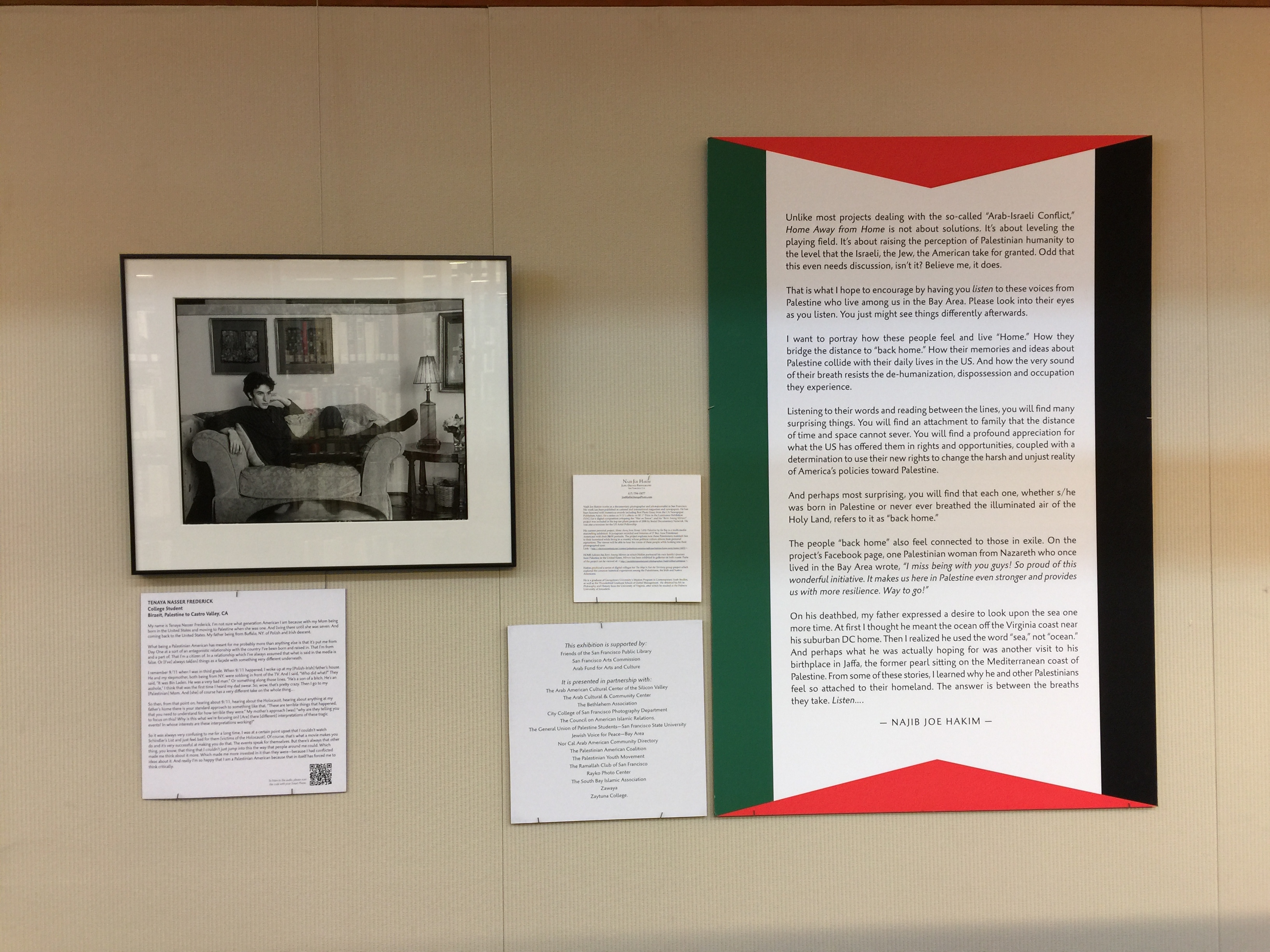 The overall theme of the exhibit draws on the immigrant experience and the importance of belonging, weaving together experiences from both Palestine and the Bay Area. As evidenced in print and on our airwaves, fear and distrust often get in the way of understanding that human experience. The library exhibit attempts to break down stereotypes, offering an all-too-rare opportunity for Palestinian-Americans to have a voice of their own.