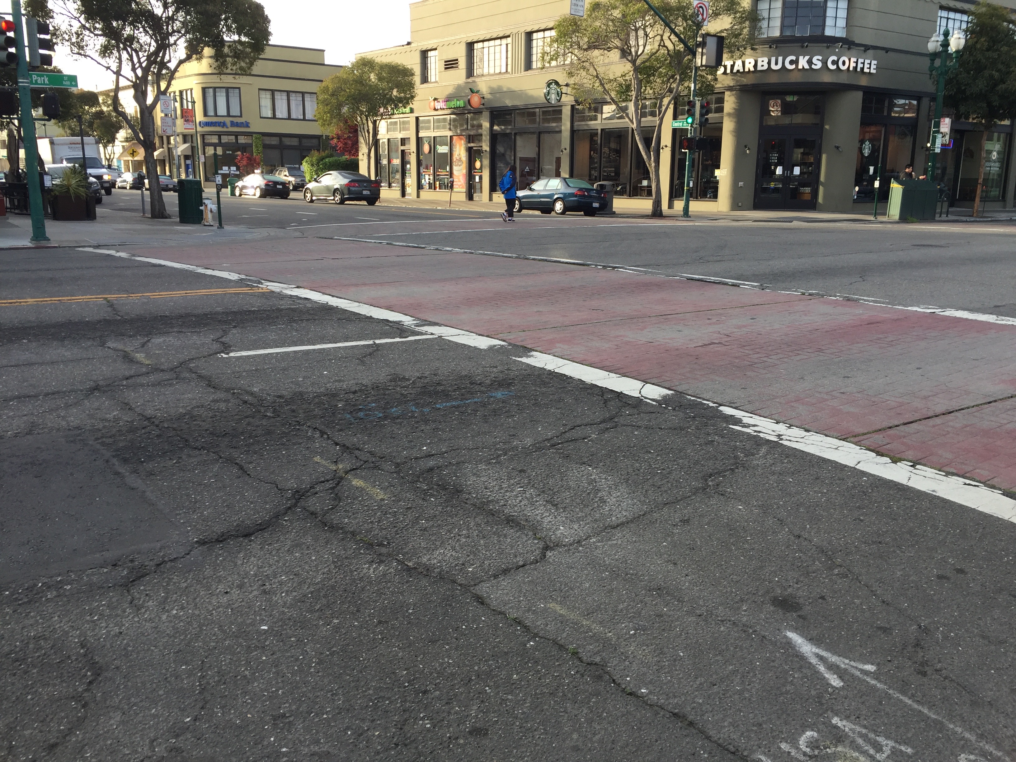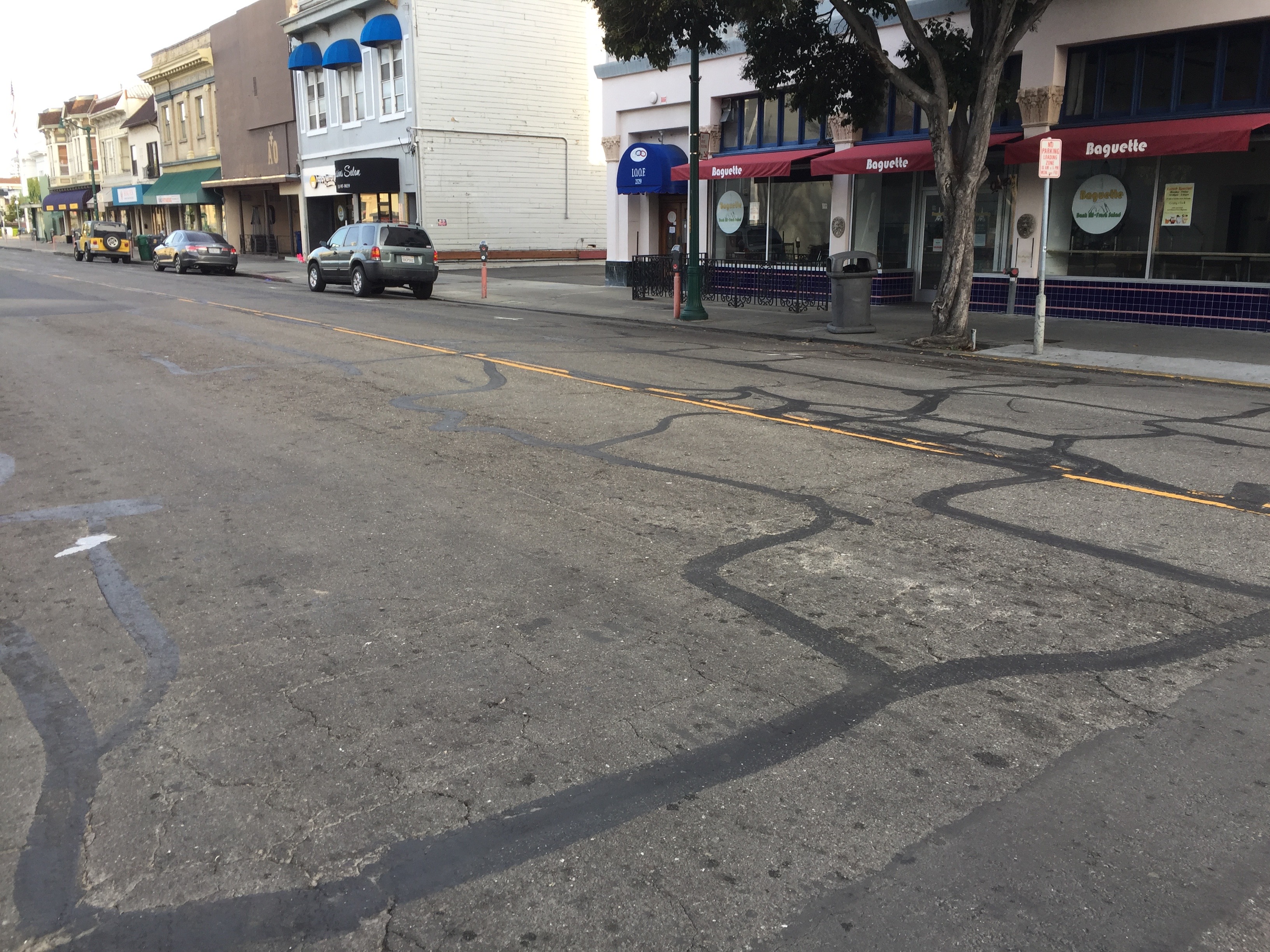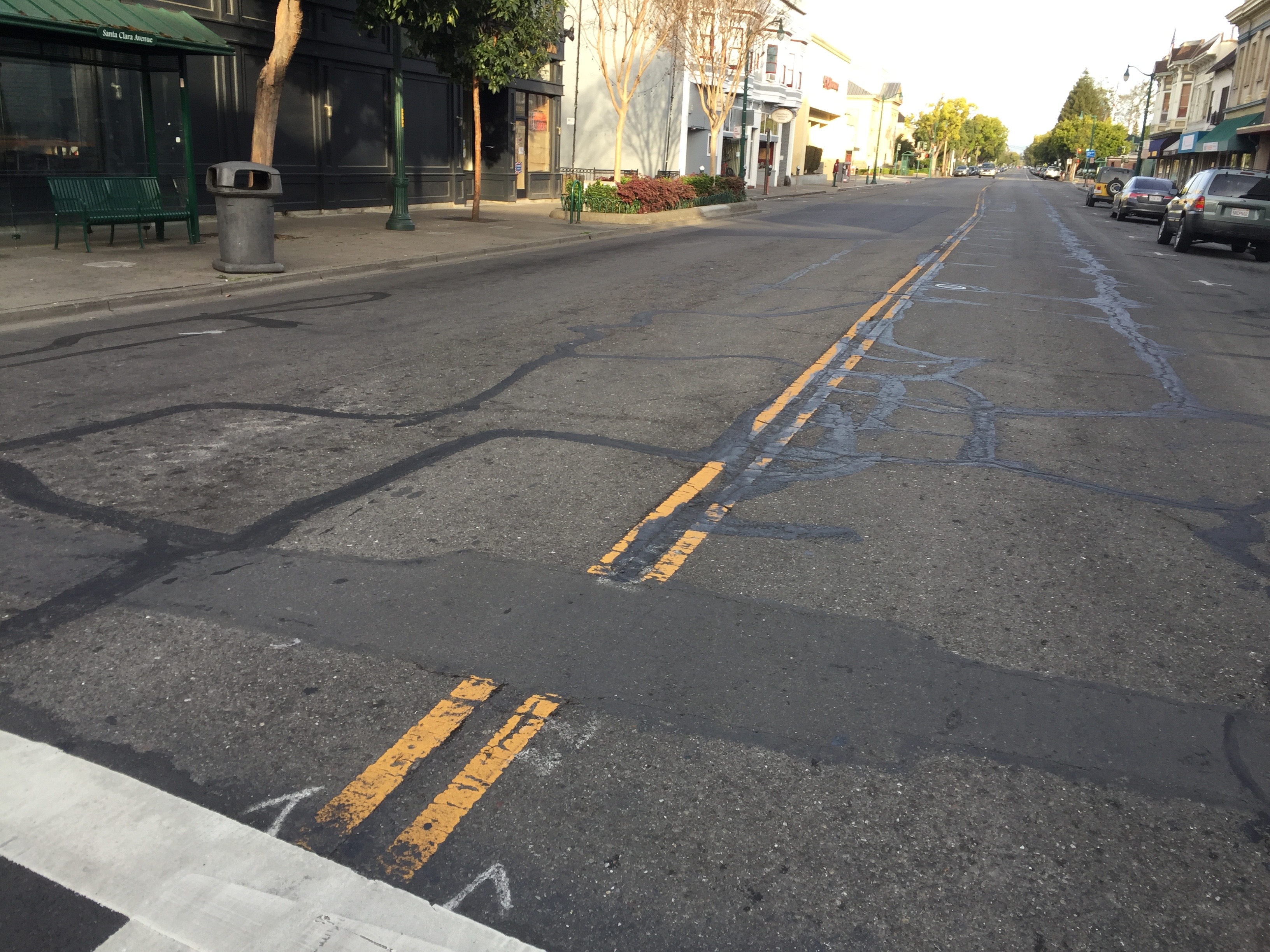While both ends of Park Street were repaved in the past couple of years, the area between San Jose and Santa Clara still needs attention. The street pavement, striping, pits and black tar lines look shabby and reflect badly on the commercial district. It looks like a place in decline.