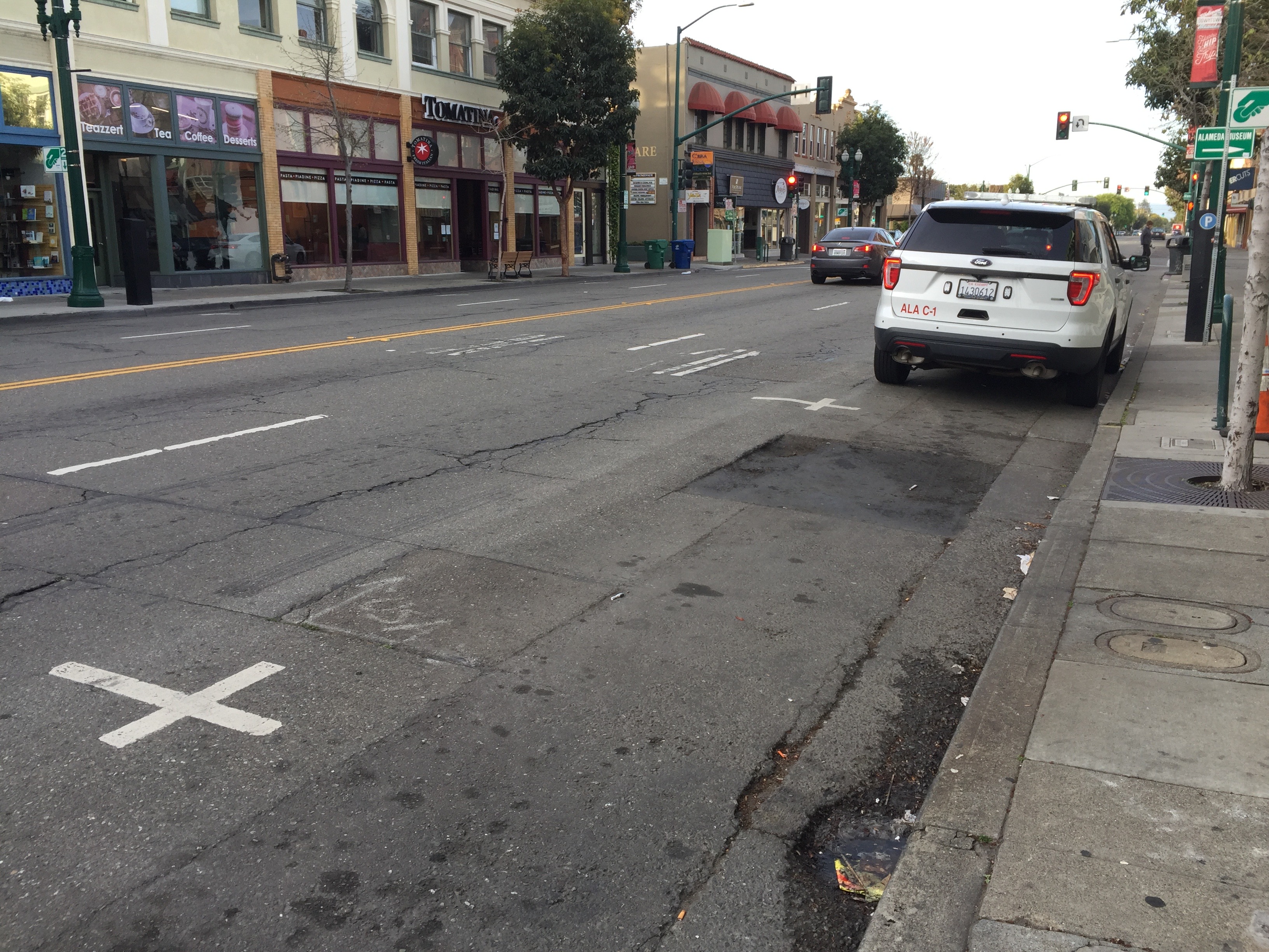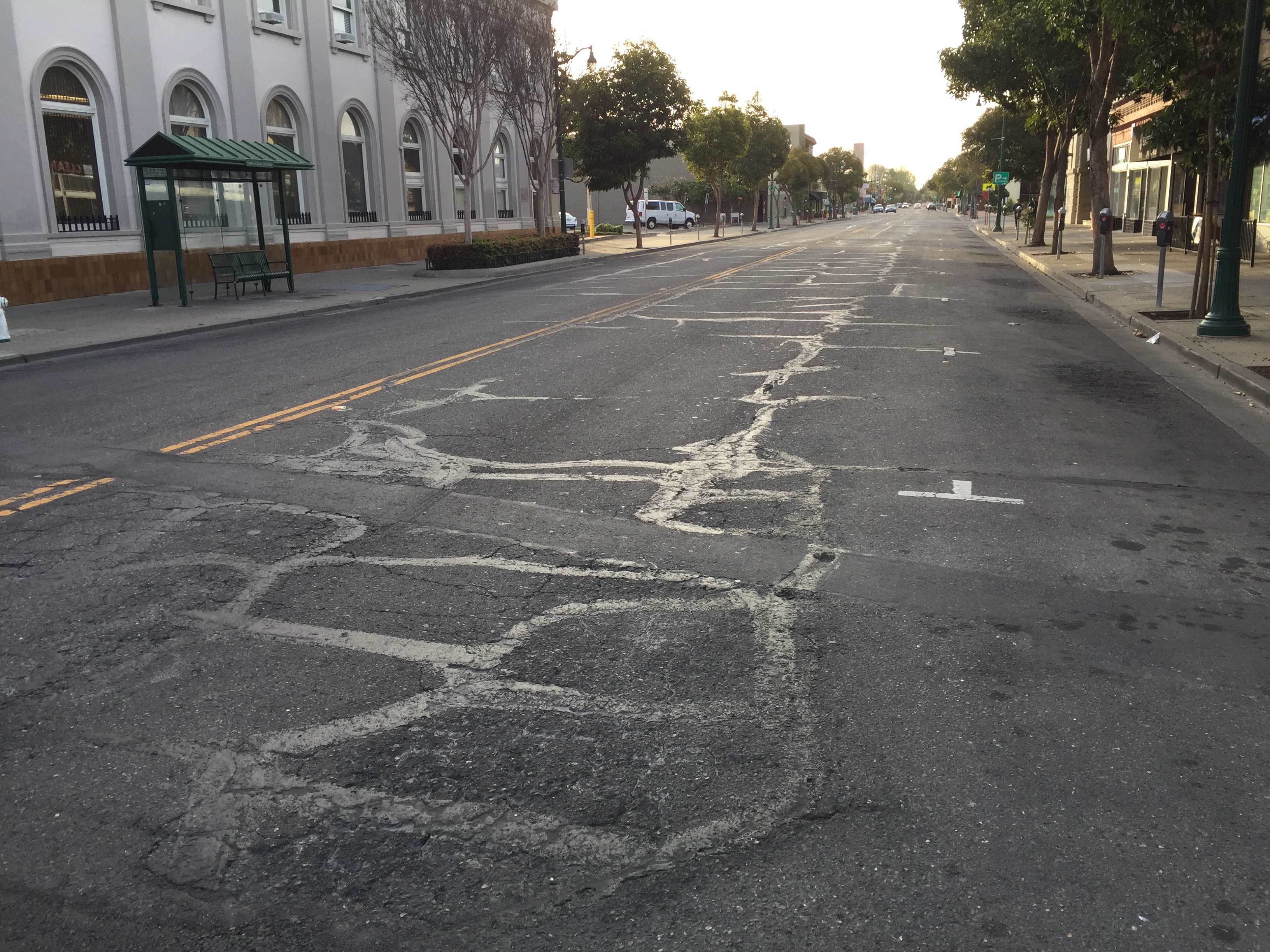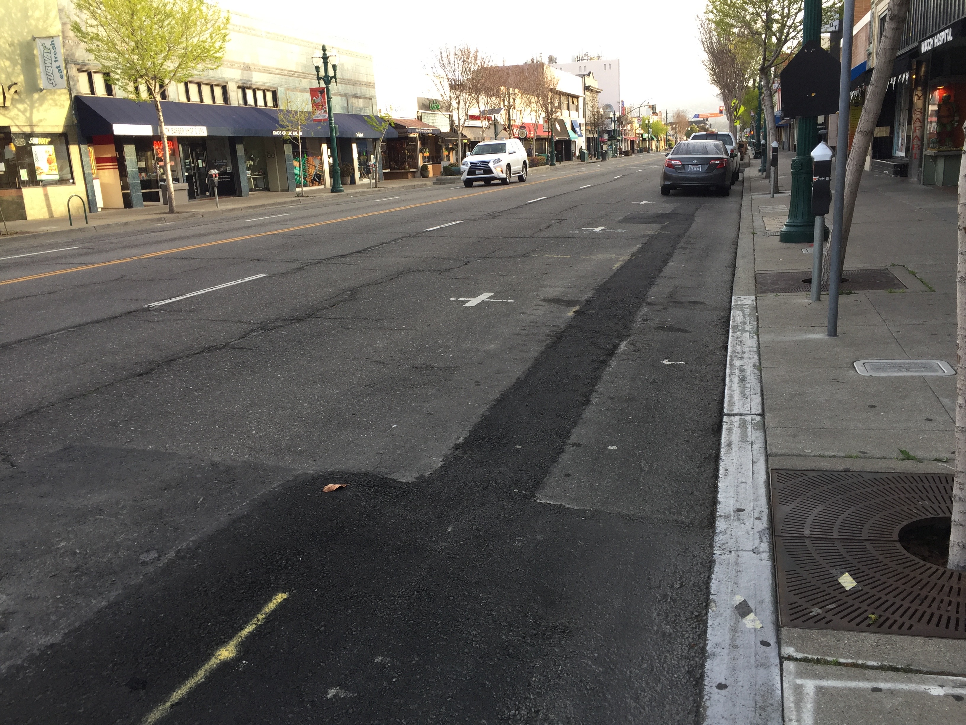 While both ends of Park Street were repaved in the past couple of years, the area between San Jose and Santa Clara still needs attention. The street pavement, striping, pits and black tar lines look shabby and reflect badly on the commercial district. It looks like a place in decline.
