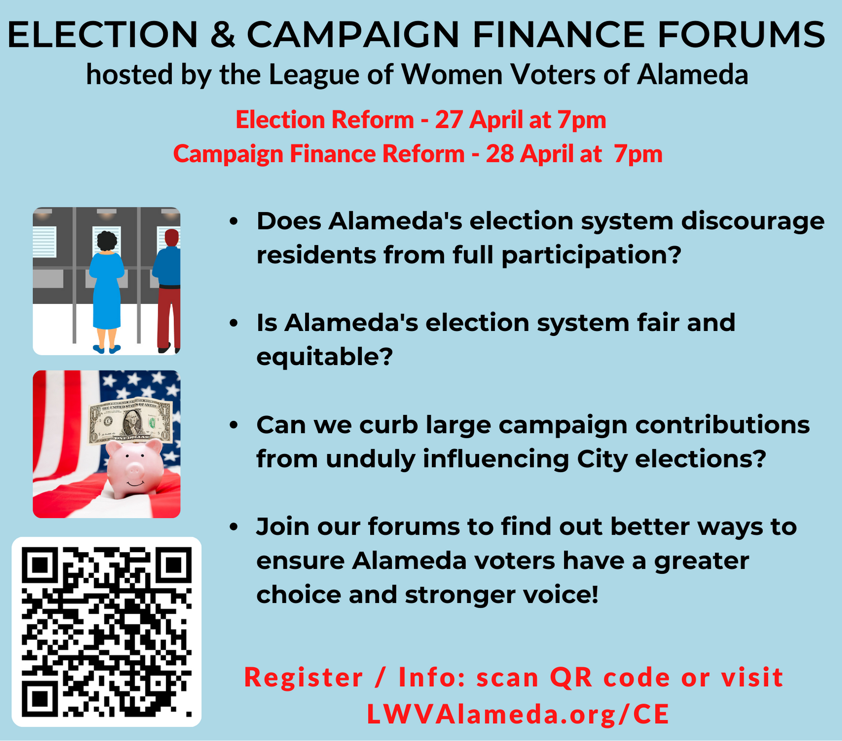 In Alameda, we are watching polarization increase along with disappointment and concern over the imbalances in politics. The forum presentations are designed to start a discussion about possible electoral reforms and ways to create a stronger democracy in Alameda, where all voices are given an equal chance to be heard.