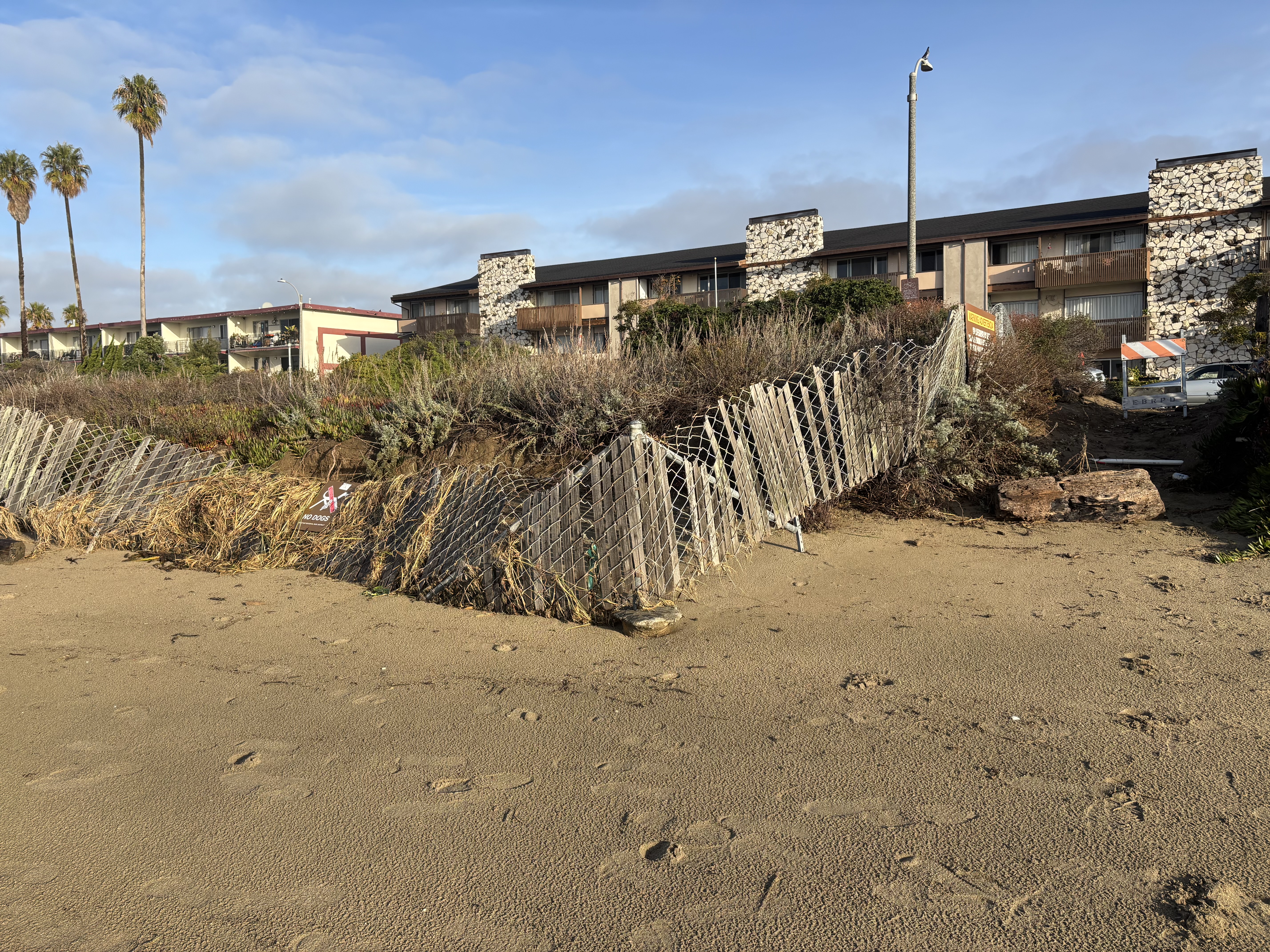 Hardly any of the fencing that is supposed to hold the dune in place remains intact along the beach.